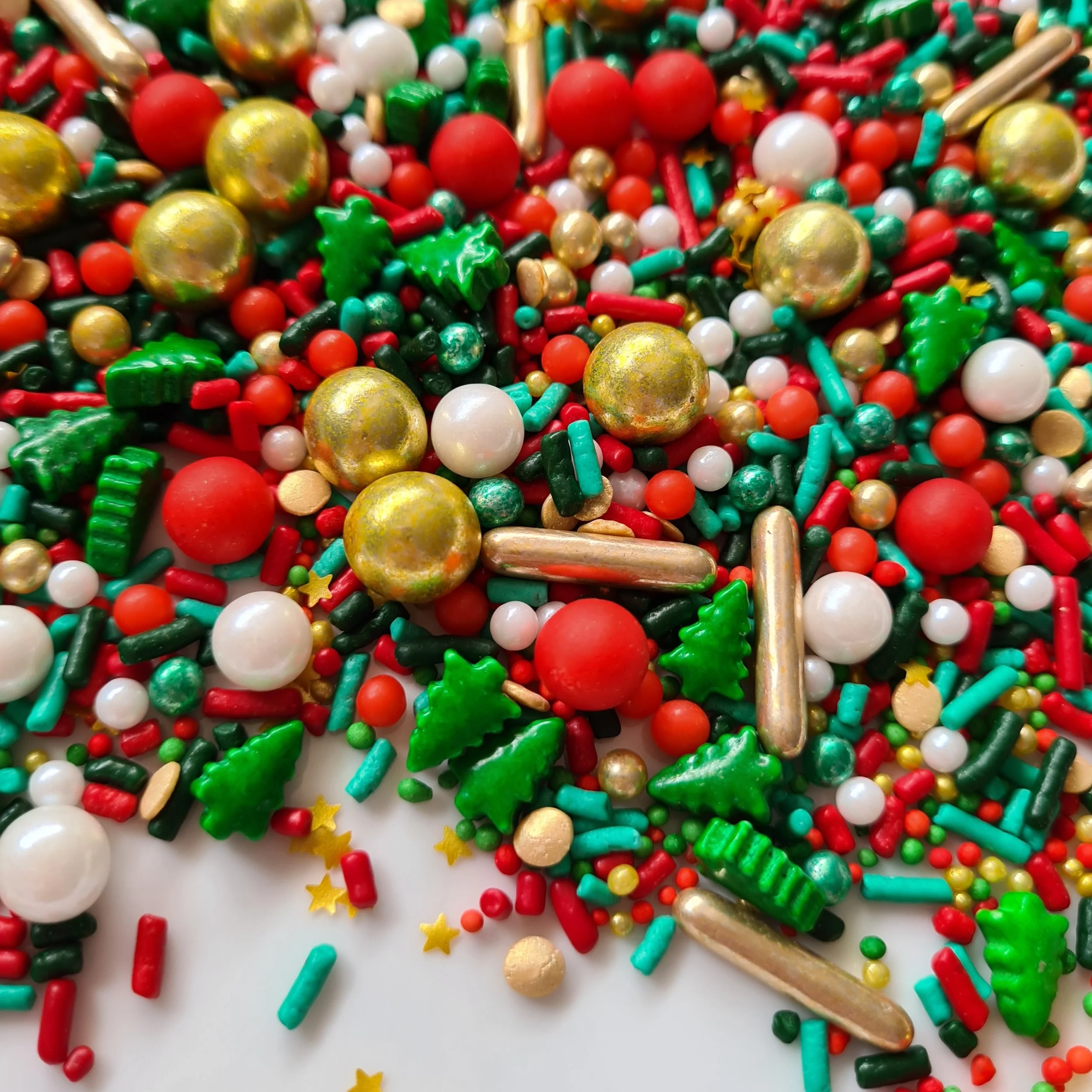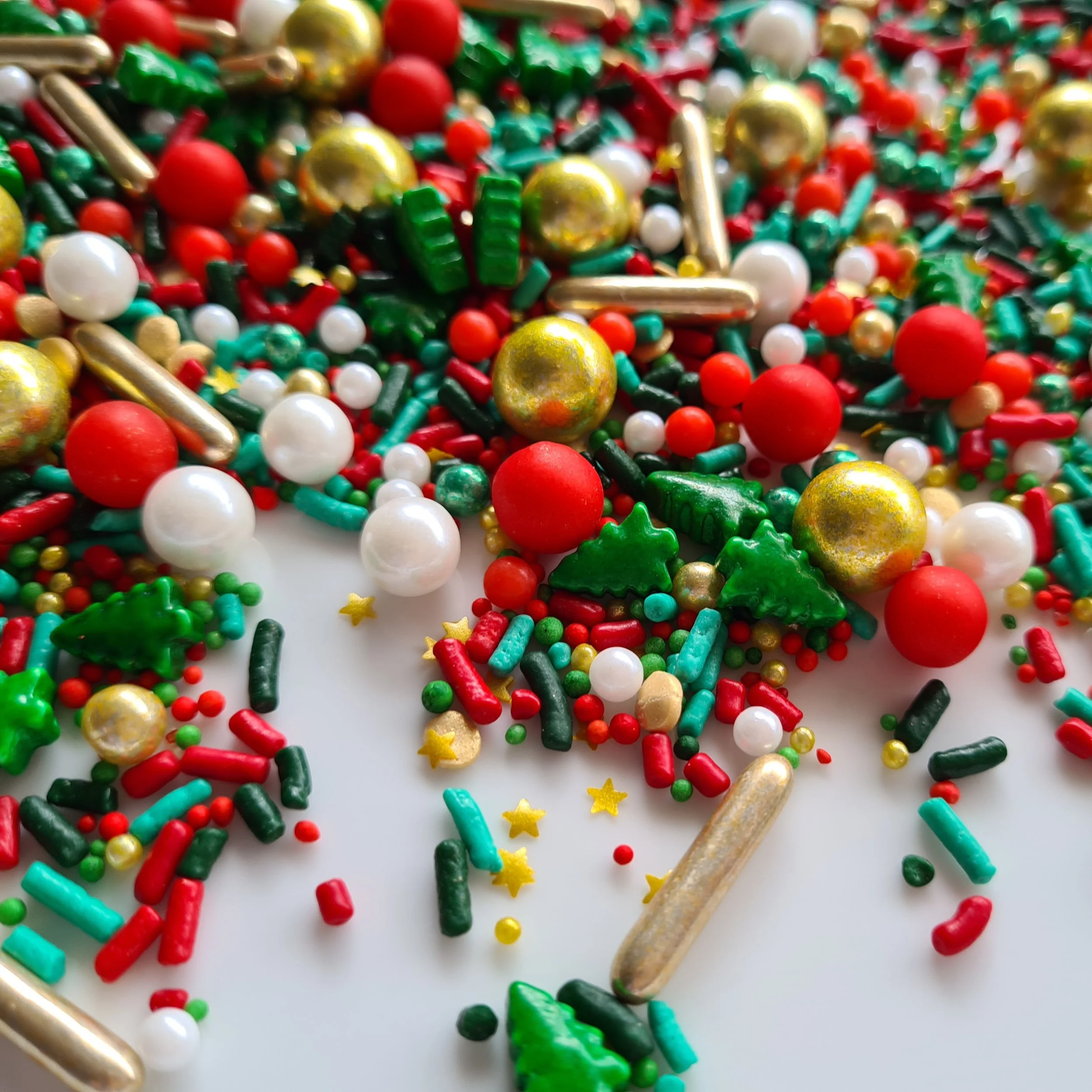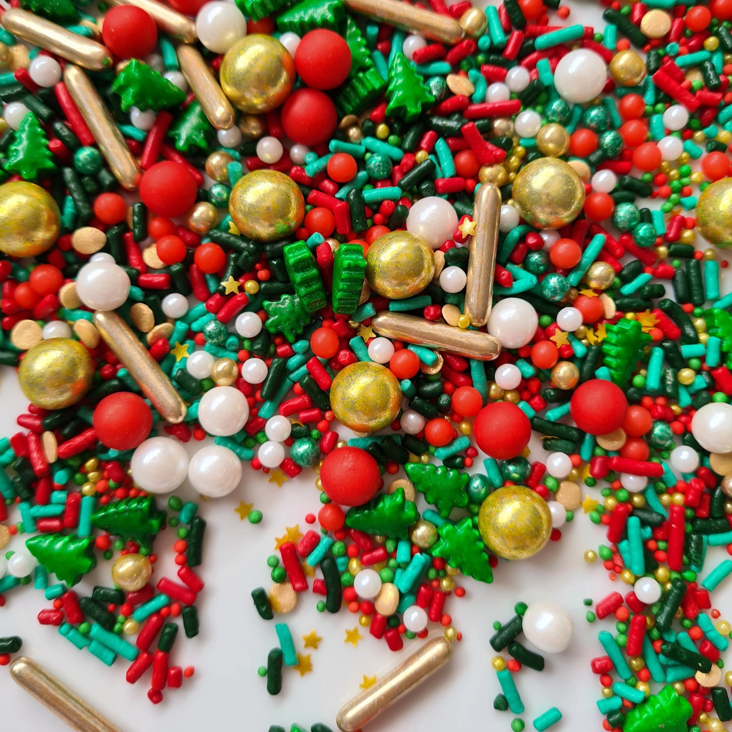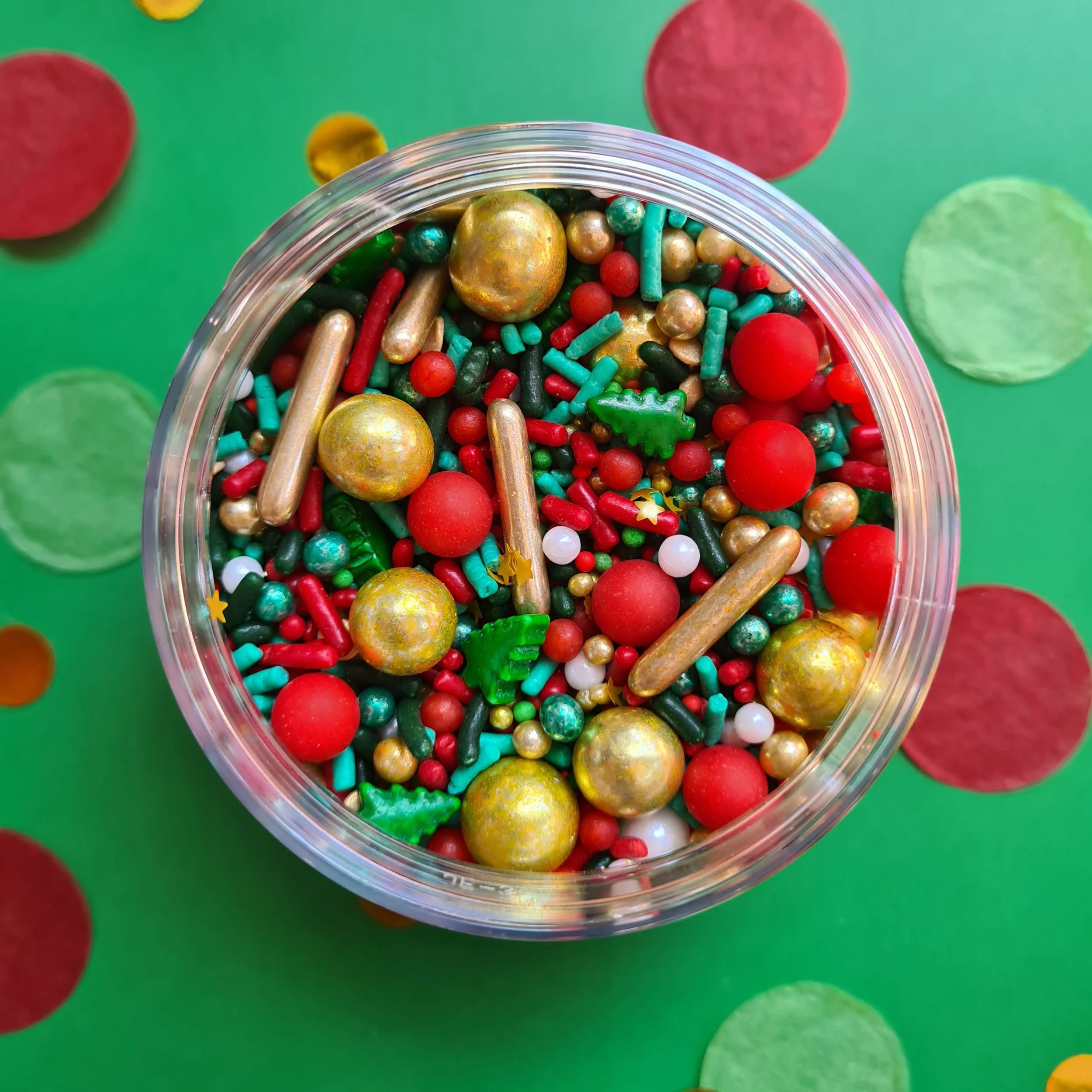 Hand mixed with love by us from a mixture of jimmies, non pareils, sugar pearls 4-10mm, confetti, tiny gold star confetti rods and Christmas trees